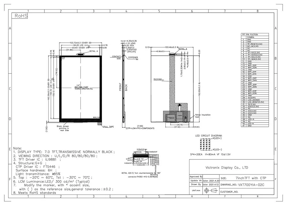 vt700yia-02c ແມ່ນໂມດູນ TFT-LCD. ມັນປະກອບດ້ວຍກະດານ TFT-LCD, Driver IC, FPC, ແສງສະຫວ່າງດ້ານຫລັງແລະ CTP. ພື້ນທີ່ສະແດງ 7.0 ¢¢ມີ 800 x (RGB) X 1280 ພິກະເຊນແລະສາມາດສະແດງສີໄດ້ເຖິງ 16.7m. ຜະລິດຕະພັນນີ້ສອດຄ່ອງກັບມາດຖານສິ່ງແວດລ້ອມຂອງ Rohs ..
